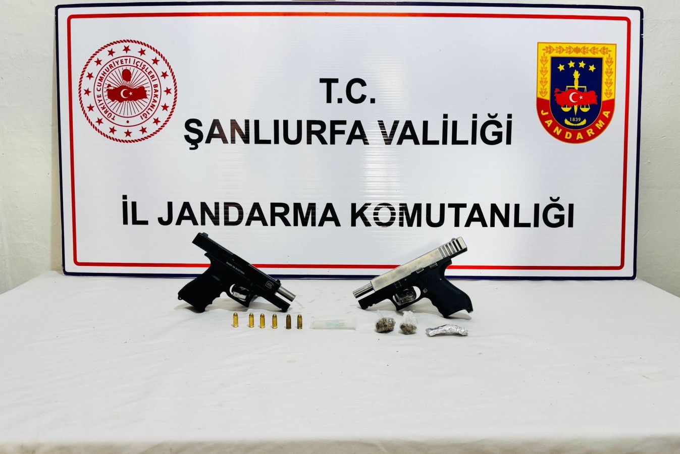 Jandarma Suç Araştırma Timi (JASAT) ekiplerinin de yer aldığı operasyonda şahsın üst aramasında 2 ruhsatsız tabanca, 2 tabanca şarjörü, 7.65 mm çapında 6 tabanca fişeği, 5 gram metamfetamin ve 7 gram esrar ele geçirildi.