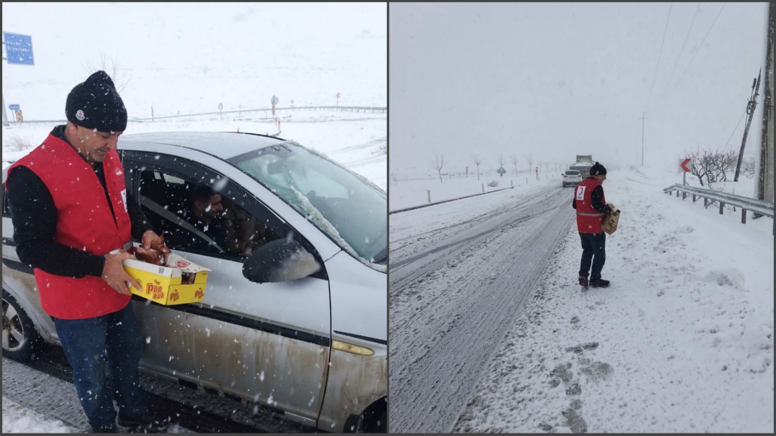 SYDV ve Kızılay ekipleri yolda kalan vatandaşlara yardım malzemeleri ulaştırıyor