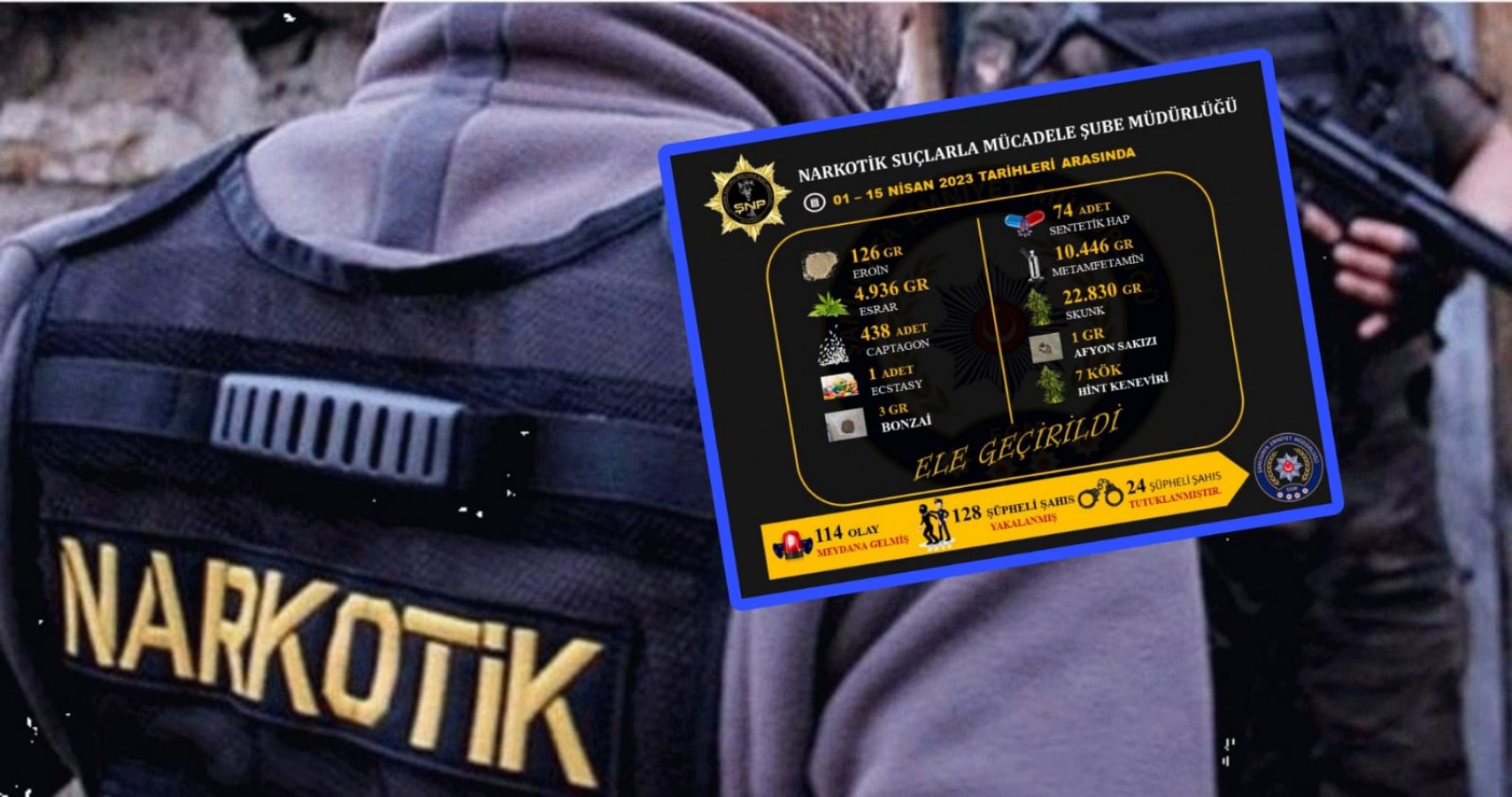 Narkotik ekipleri, meydana gelen 114 olayda 128 şüpheli şahsı
