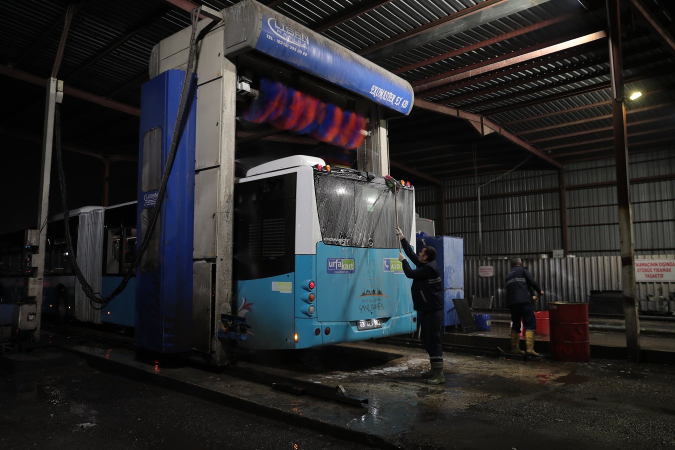 Şanlıurfa’da şehir içi ulaşımı sağlayan Şanlıurfa Büyükşehir Belediyesi BEL-SAN A.Ş’ye ait ulaşım araçları, günlük olarak temizlenerek sefere hazırlanıyor.